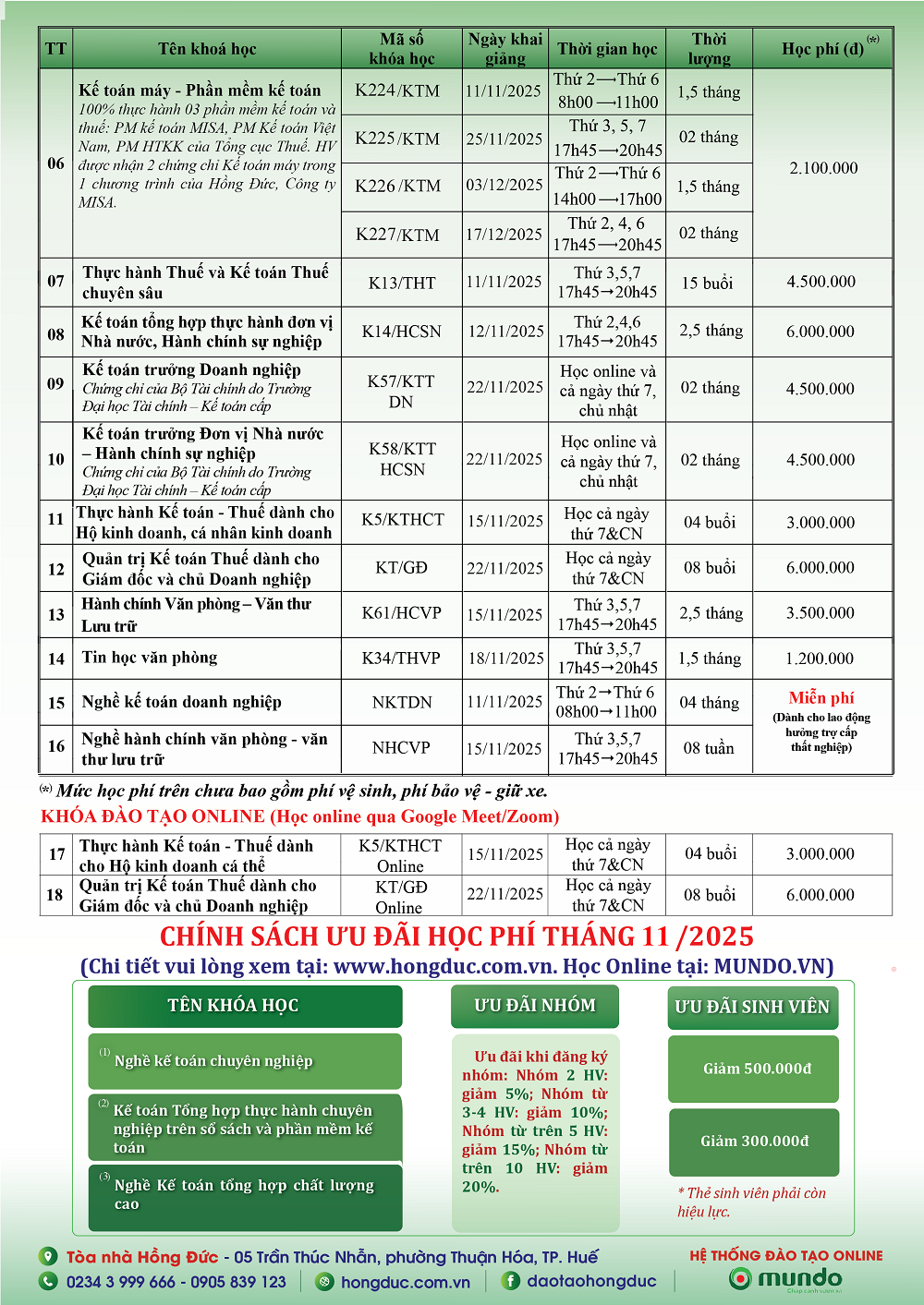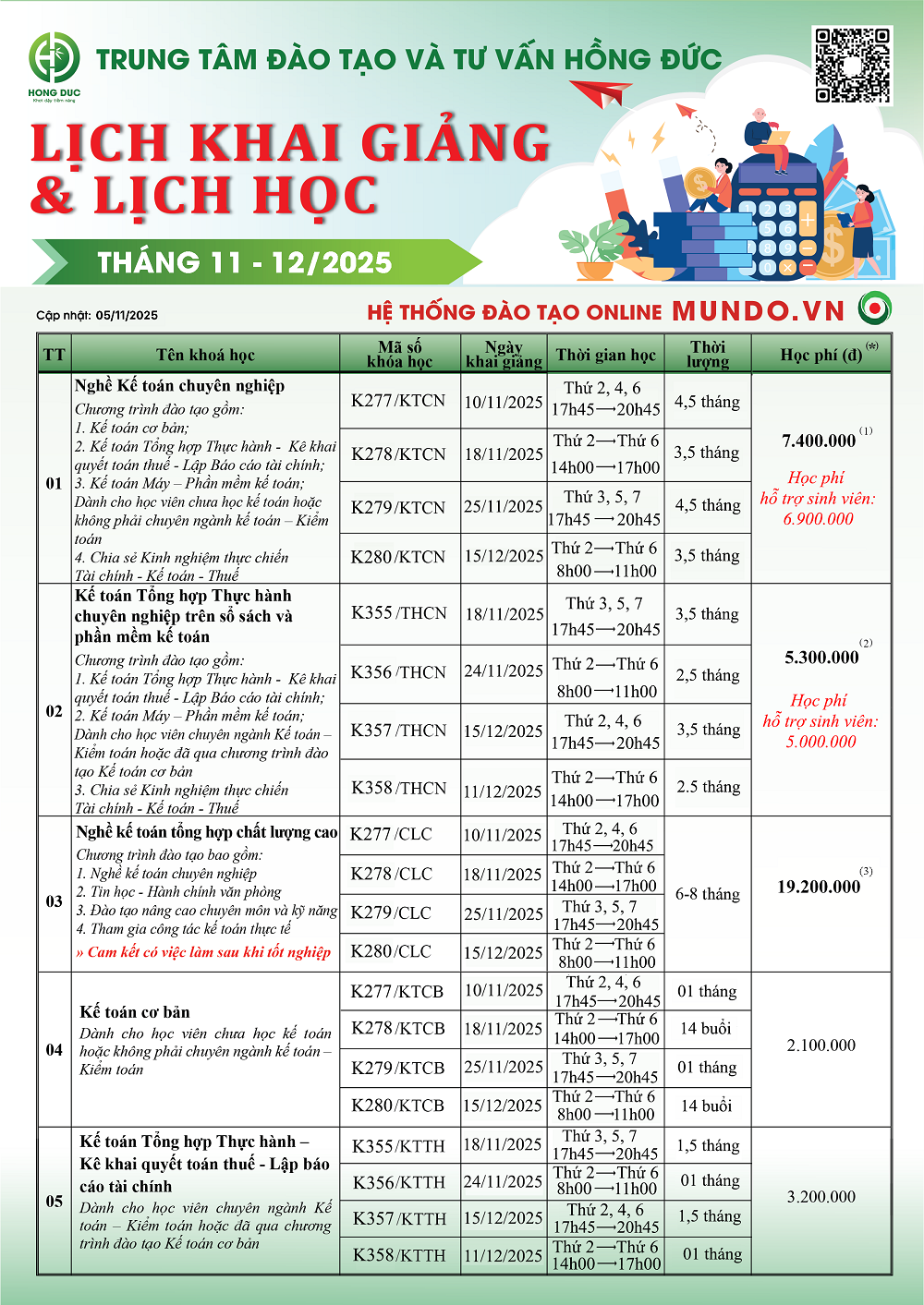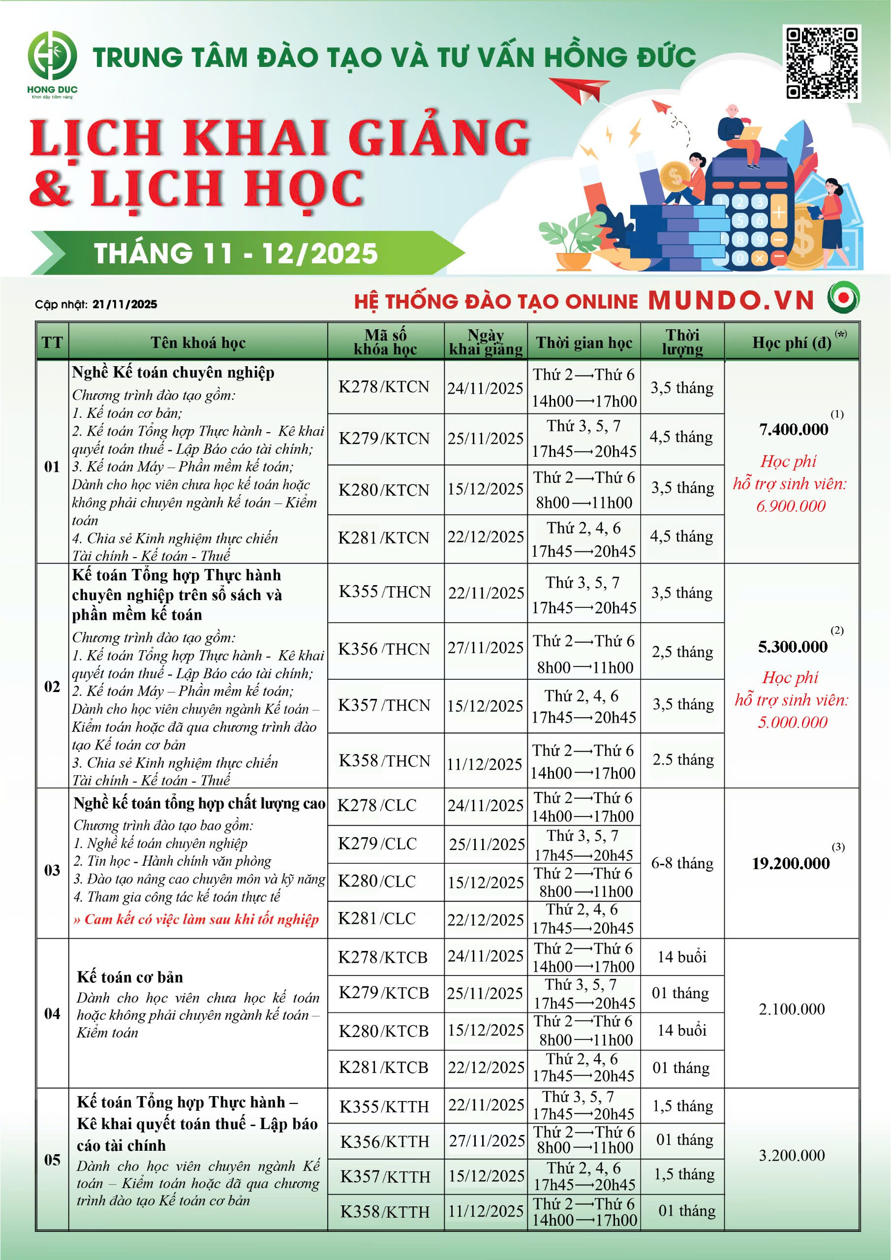 💚 Trung tâm Đào tạo và Tư vấn Hồng Đức kính xin thông báo lịch khai giảng tháng 11 & 12/2025 như sau:LỊCH KHAI GIẢNG THÁNG 11 & 12.2025