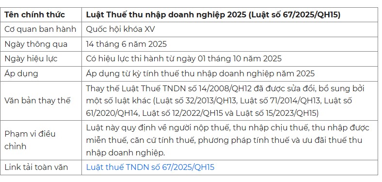 Luật Thuế Thu nhập doanh nghiệp (TNDN) 2025 số 67/2025/QH15 là văn bản quan trọng được Quốc hội khóa XV thông qua ngày 14 tháng 6 năm 2025, chính thức có hiệu lực từ ngày 01 tháng 10 năm 2025 và áp dụng từ kỳ tính thuế TNDN năm 2025, thay thế Luật TNDN 2008.