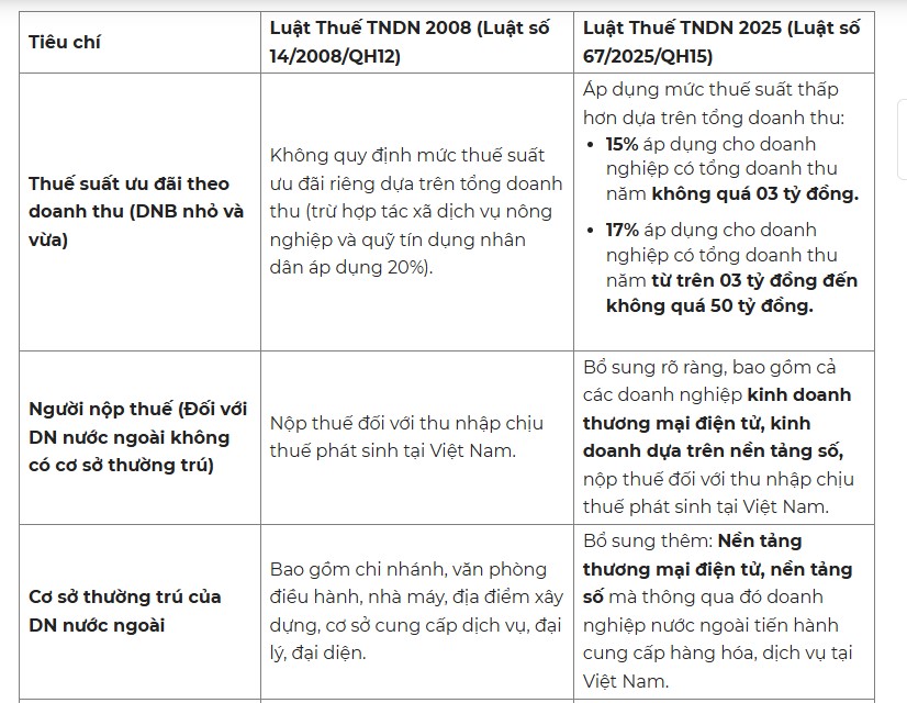 2. Điểm khác biệt giữa Luật Thuế TNDN số 14/2008/QH12 và Luật Thuế TNDN số 67/2025/QH15