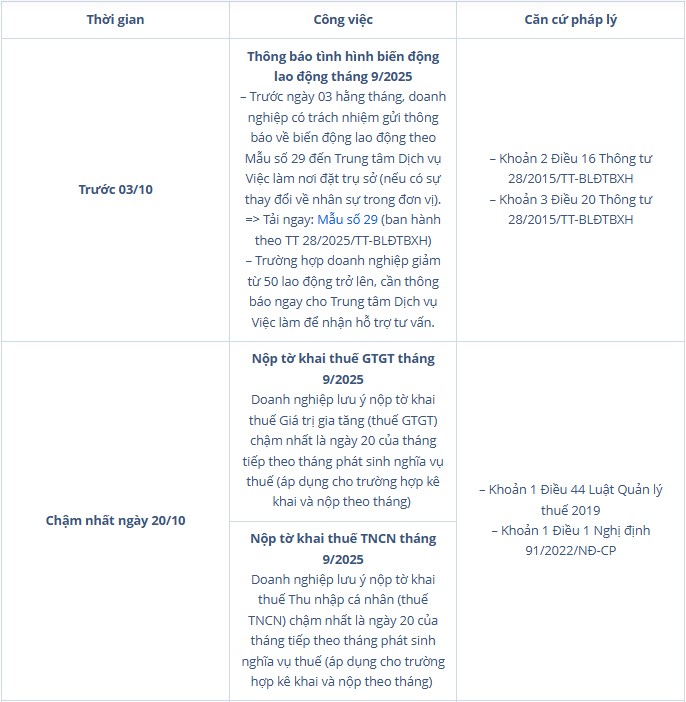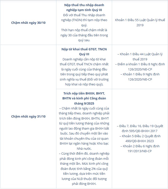 CÁC CÔNG VIỆC KẾ TOÁN PHẢI THỰC HIỆN TRONG THÁNG 10/2025 (2025-09-30 08:05:30)