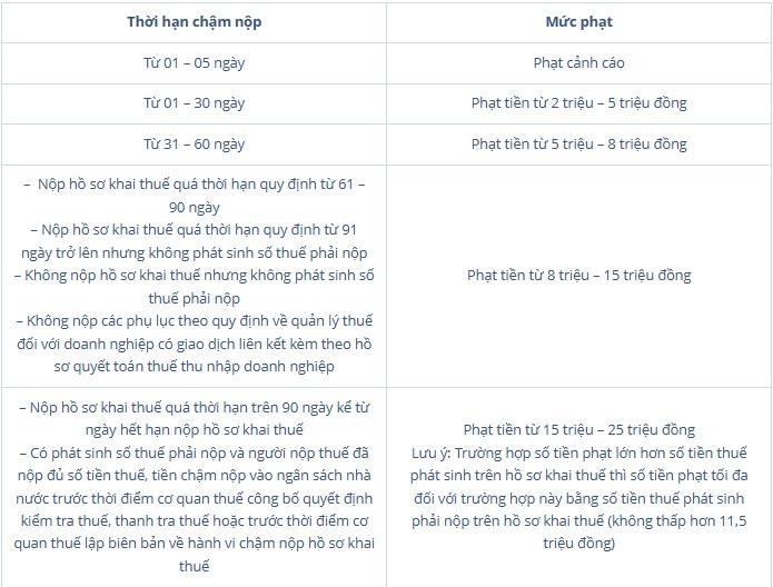 Mức phạt nộp chậm tờ khai thuế GTGT, TNDN, TNCN, lệ phí môn bài (2023-04-28 07:16:21)