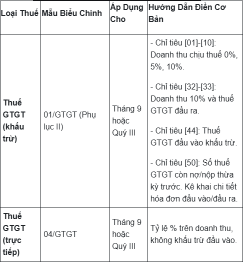 - Hồ sơ khai thuế kỳ tháng 9/2025: Chậm nhất ngày 20/10/2025 (áp dụng cho người nộp thuế kê khai theo tháng).