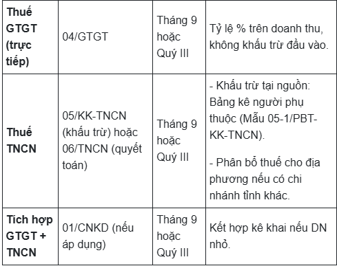 - Hồ sơ khai thuế Quý III/2025 (tháng 7-9): Chậm nhất ngày 31/10/2025 (áp dụng cho người nộp thuế kê khai theo quý, nếu đáp ứng tiêu chí như doanh thu năm trước dưới 50 tỷ đồng).