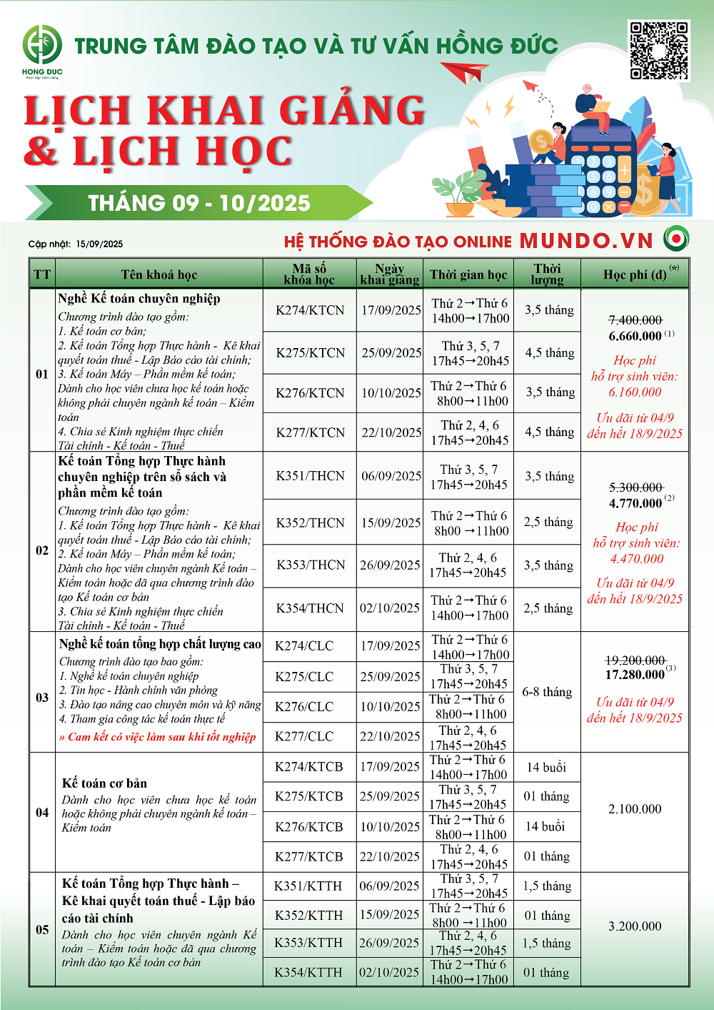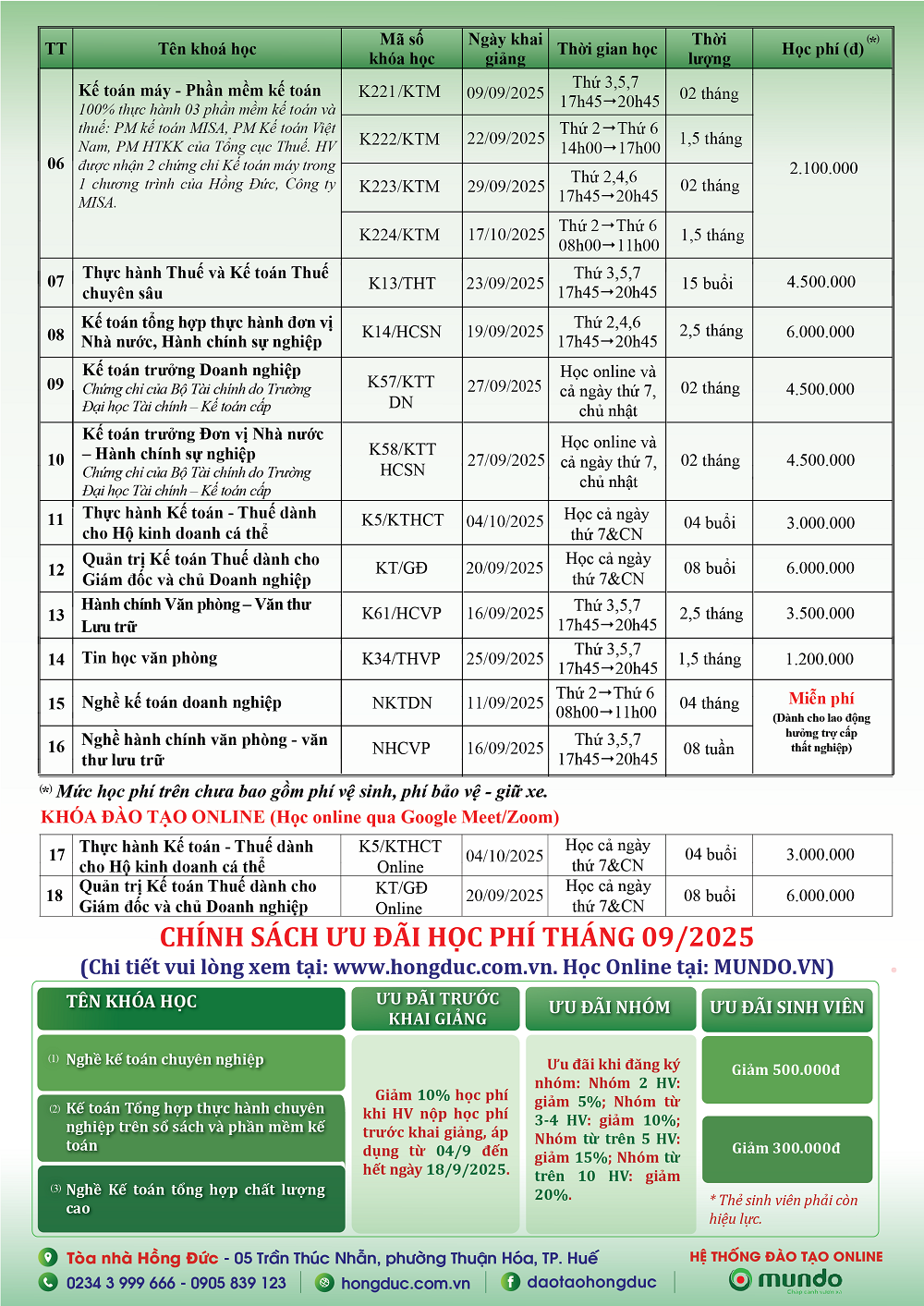 Bạn đã lỡ mất khung ưu đãi lớn dịp 2/9? Đừng vội tiếc nuối, vì cơ hội vẫn còn dành cho bạn!Trung tâm Hồng Đức tiếp tục mang đến ƯU ĐÃI 10% học phí cho tất cả các khóa học kế toán – thuế, áp dụng đến 18/09/2025. Với hệ thống khóa học đa dạng, bạn có thể lựa chọn lộ trình phù hợp nhất: - Nghề Kế toán Chuyên nghiệp – Trang bị đầy đủ kỹ năng, tự tin làm việc ngay. Dù bạn là sinh viên trái ngành hoặc mới ra trường, nhân viên kế toán muốn nâng cao trình độ, hay chủ doanh nghiệp cần hiểu để quản trị – Hồng Đức đều có khóa học phù hợp. Ưu đãi chỉ áp dụng đến hết 18/09/2025 – Đăng ký ngay hôm nay để không bỏ lỡ cơ hội đầu tư cho sự nghiệp kế toán của bạn! ----------------------------------------------------