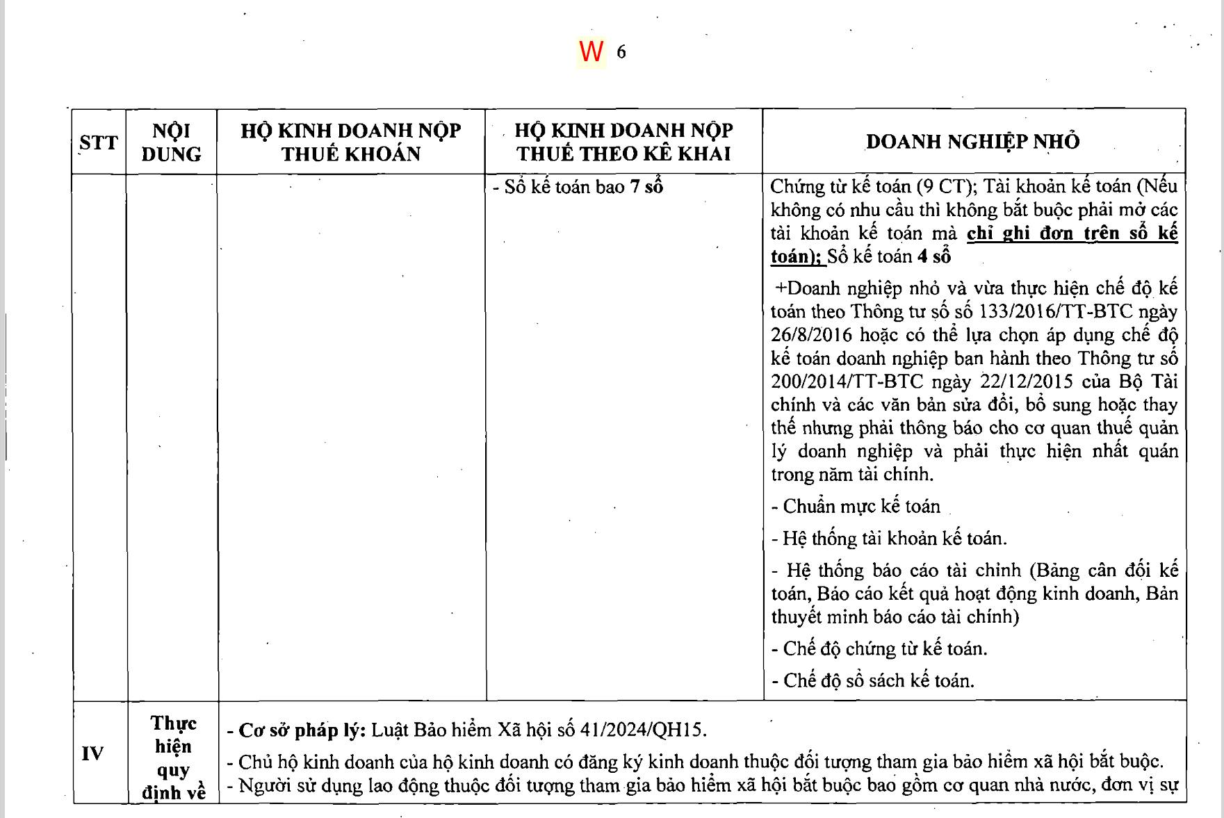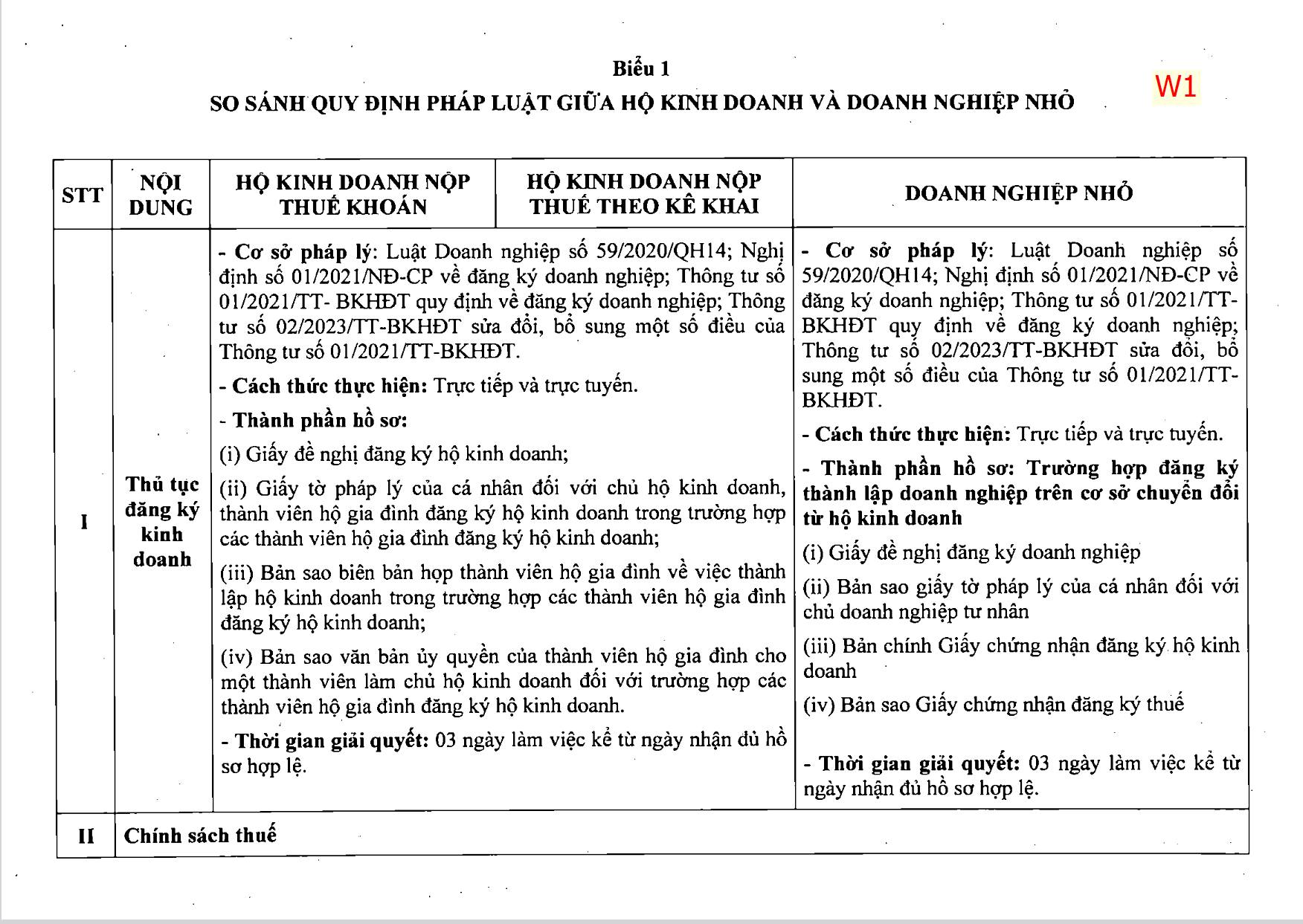 Vừa qua, Bộ Tài chính đã ban hành Quyết định số 3389/QĐ-BTC năm 2025, phê duyệt Đề án “Chuyển đổi mô hình và phương pháp quản lý thuế đối với hộ kinh doanh khi xóa bỏ thuế khoán”.Theo đó, Biểu 1 của Đề án đã nêu rõ bảng so sánh quy định pháp luật giữa hộ kinh doanh và doanh nghiệp nhỏ về: